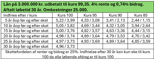 I tabellerne her er lånet optaget med et lille kurstab i starten og indfries undervejs til en måske lavere kurs. Men man kan jo også blive fristet af at optage et 3,5% lån i stedet for 4%.