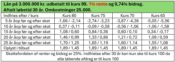 Og her viser vi eksempler på 1% lån som er optaget for nogle år siden, og som kan indfries til lav kurs nu.