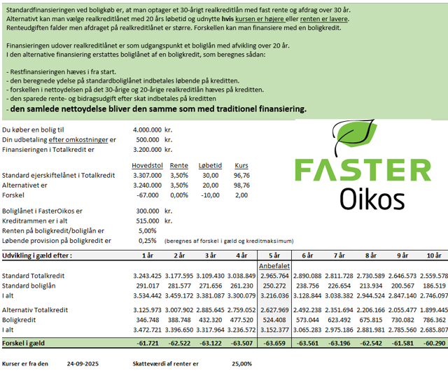 Tilbudskursen på realkreditlånet er den 24.9.25 i Totalkredit 96,76 så man får altså et kurstab på 32.400 kr. pr. million man låner. Men man kan også tage realkreditlånet med 20 års løbetid. Her er renten også 3,50% men tilbudskursen er 98,76 så kurstabet falder til 12.400 kr. pr. million.