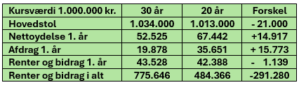 Kursfølsomheden på 20-årige lån er lidt mindre end på 30-årige lån, så hvis renten stiger og man vil konvertere til højere rente, vil kursgevinsten være lidt mindre med 20-årig finansiering.