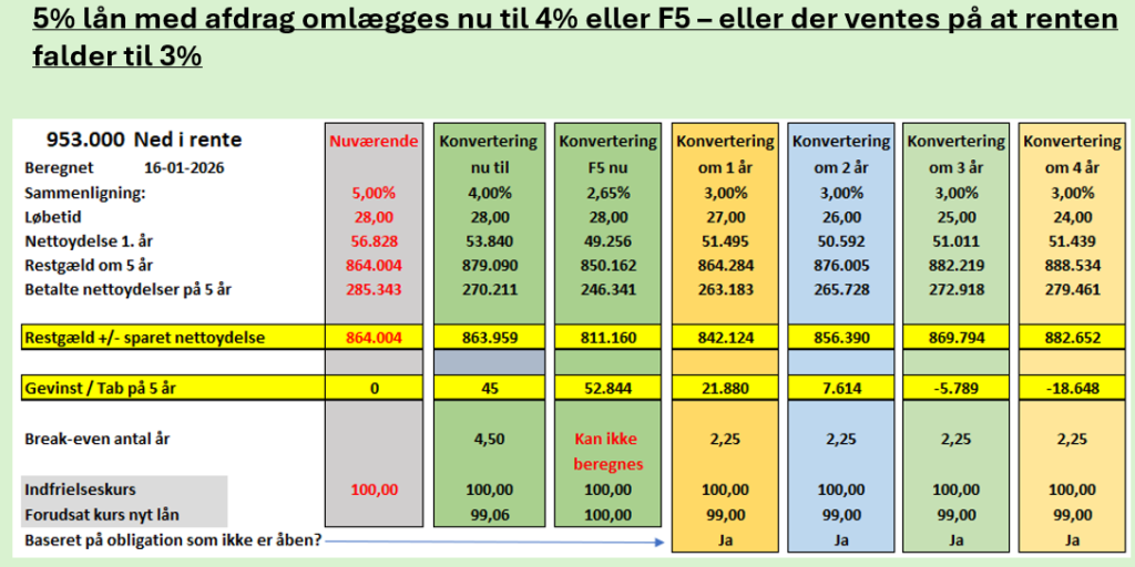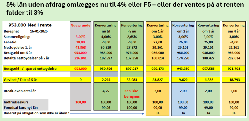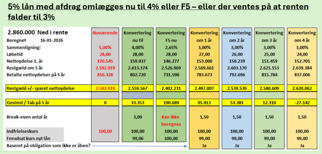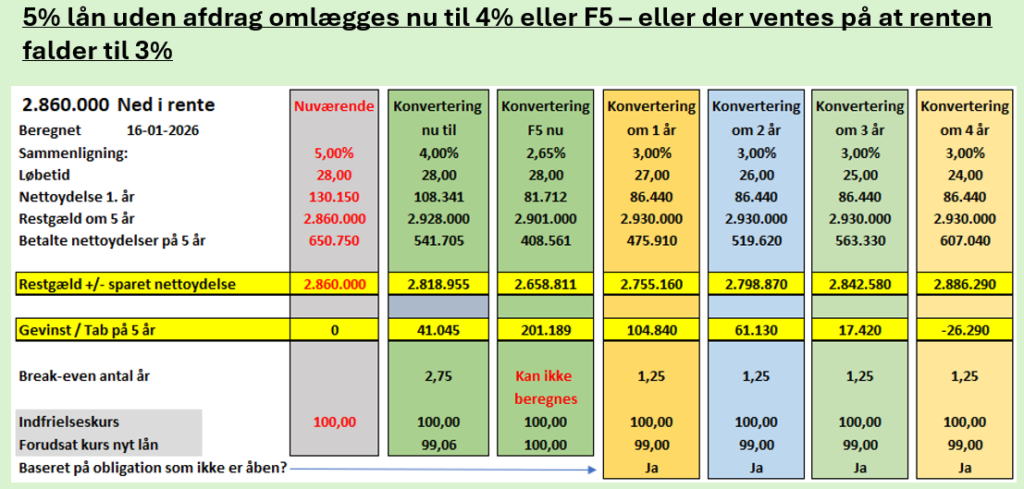 Et 5% lån på oprindeligt 3 mill. er nu nedbragt til 2.860.000 kr. Det kan omlægges til 4% i den afdragsfri serie uden at bruge afdragsfriheden og kursen er 99. Eller det kan omlægges til F5, hvor kursen er 100.