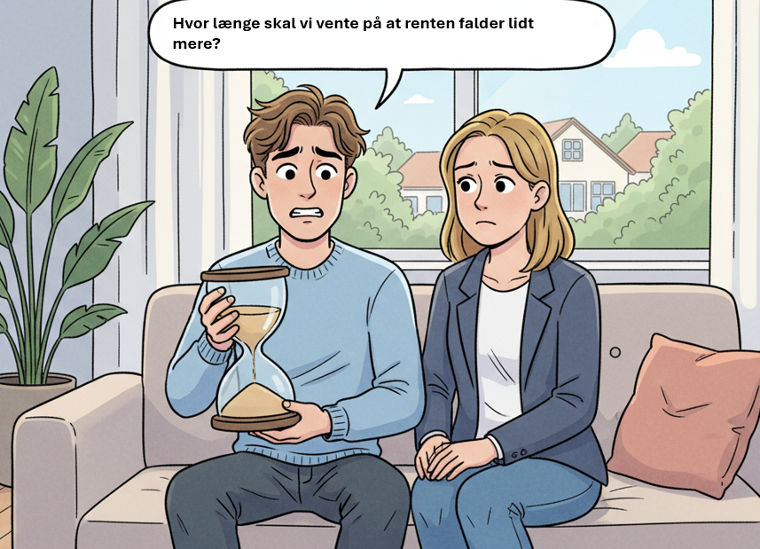 Venter man med at omlægge 5%-lånet fordi man tror eller håber på, at renten falder mere, så skal man huske på, at man måske får en større rentegevinst senere, men at man indtil da betaler mere i rente end man behøver.