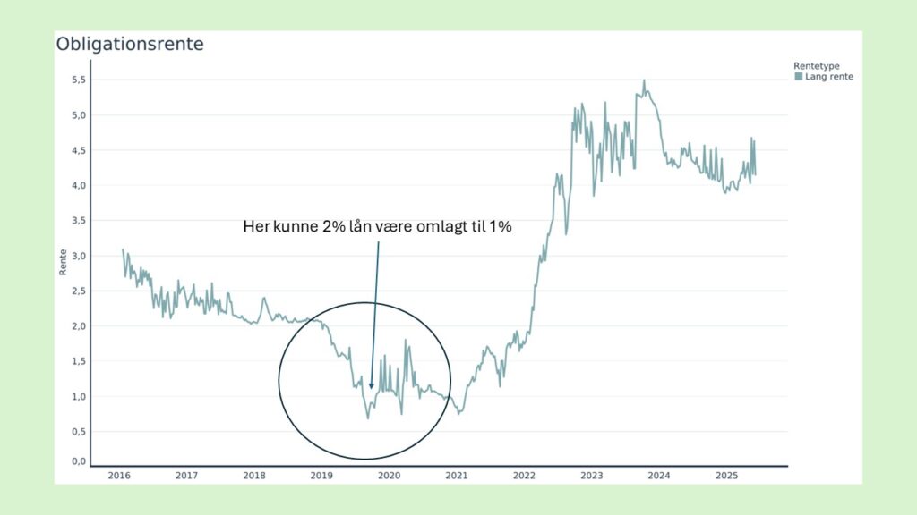 Men hvis man ser lidt længere til højre på kurven, kan man se, at muligheden for at omlægge til 1% lån er udløbet for længe siden. Aktuelt er renten på lån med 30 års løbetid 4%, og det betyder, at hvis man er i den gruppe som ikke fik omlagt til 1% lån, så har man muligheden for at konvertere til højere rente nu. Her får man en lavere gæld og så er man klar til at nedkonvertere, hvis renten senere falder til 3% eller lavere. Og dermed sikre den finansielle robusthed, som Nationalbanken kalder det.