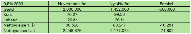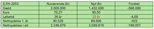 Hvis ikke man vælger omlægningsmuligheden til 4% lån, så fortsætter man bare med at betale 0,5% i rente. Men man betaler også de løbende afdrag til kurs 100 i stedet for at indfri til kurs 70,27 nu.