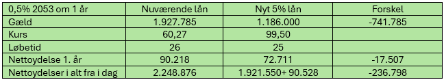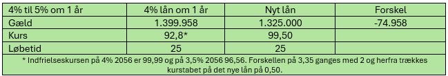 Gevinsten ved at vente på 5% lånet i 1 år vil altså være på 164.996 kr., i forhold til at omlægge til 4% nu, målt på de samlede nettoydelser over 26 år. Men hvis der kan omlægges til 5% om 1 år, vil der også være mulighed for at omlægge 4% lånet til 5%, og det ville se sådan ud: