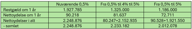 Den samlede gevinst ved at satse/håbe på et 5% lån om et år kan altså være en lavere gæld på 139.000 kr. og en samlet sparet nettoydelse på 221.104 kr. i lånets løbetid, og i begge tilfælde samlede nettoydelser som er lavere, end hvis 0,5% lånet beholdes i hele løbetiden.