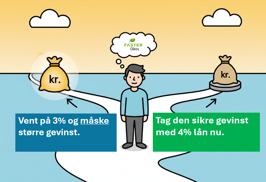 Hvis man venter og ikke får omlagt til 4% kan man risikere, at renterne ikke falder, men stiger tilbage til 5% så man helt går glip af gevinsten ved at omlægge til 4% nu.
