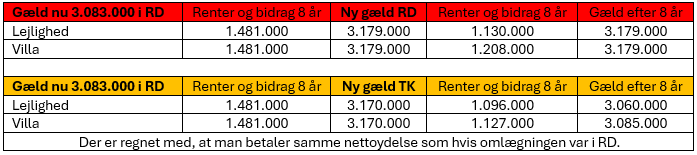 Her sammenligner vi en traditionel konvertering i Realkredit Danmark til de nye lavere bidragssatser, og en tilsvarende konvertering til lån med alternativ afdragsfrihed i Totalkredit og FasterOikos.